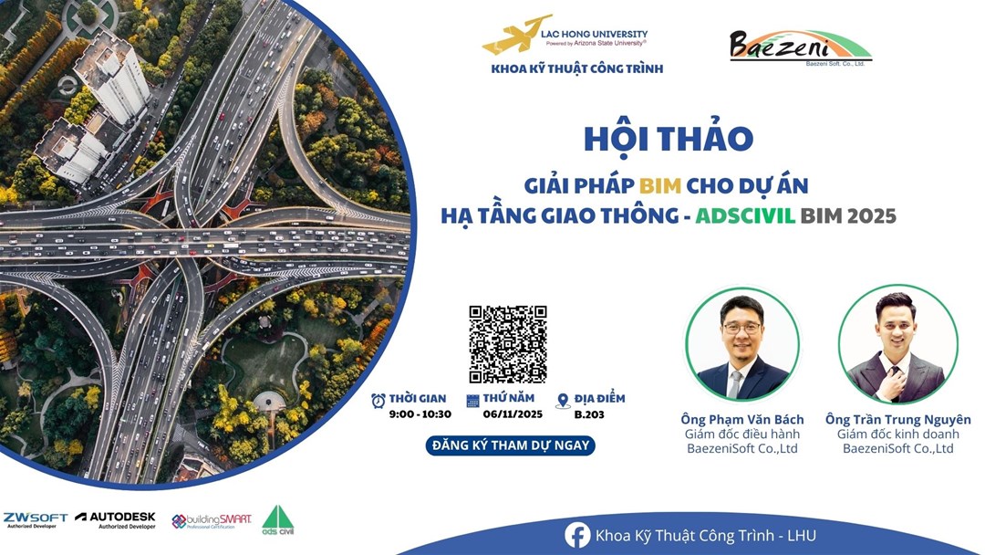 Khoa Kỹ thuật công trình, Trường Đại học Lạc Hồng trân trọng thông báo về việc tổ chức Hội thảo chuyên đề "BIM trong Hạ tầng Giao thông" với sự phối hợp của Công ty TNHH Phần mềm Baezeni.